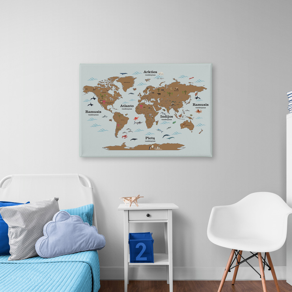 Attēls "Pasaules karte ar dzīvniekiem" uz audekla - ne tikai sienas dekors, bet arī spēcīgs izglītojošs rīks, kas veicina skolēnus vizuāli izpētīt kontinentus, jūras un dzīvnieku pasauli. Katrs dzīvnieka attēls kartē - no majestātiskajiem ziloņiem, kas pastaigājas pa Āfrikas savannām, līdz delfīniem, kas peld jūrās, sniedz zināšanas par pasaules iedzīvotājiem. Katrā pasaules kartē varat atrast valstu un galvaspilsētu nosaukumus lietuviešu valodā, tāpēc ikvienam bērnam, kas jau spēj atpazīt burtus, tas ir lielisks vingrinājums ģeogrāfijas un lasīšanas mācībām.