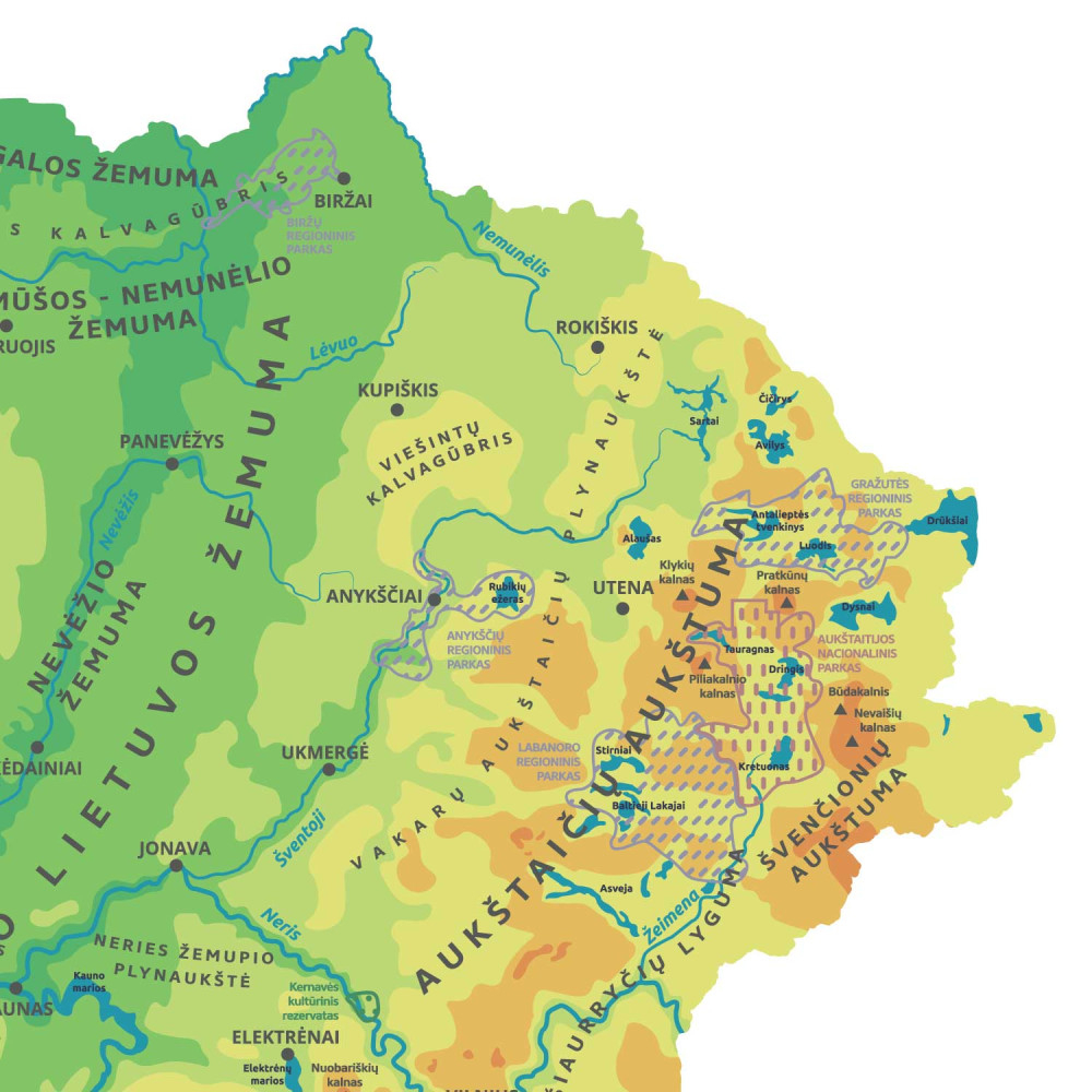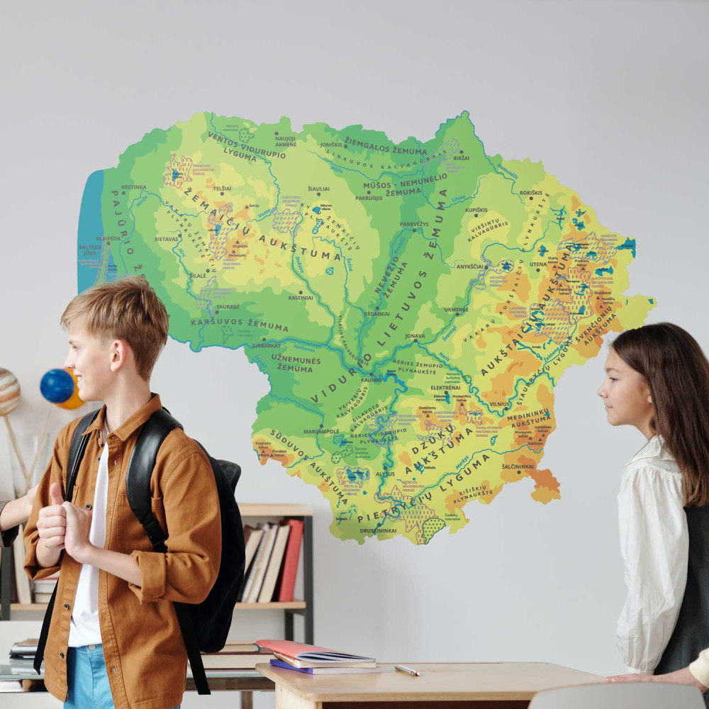 An engaging wall sticker - "Lithuanian natural map" is not only a modern school interior solution, but also a practical passive learning tool! The colorful relief map of Lithuania encourages children's curiosity and introduces them to the geographical features of Lithuania. The educational sticker vividly depicts the surface details of Lithuania, such as heights and lows, the highest mountains and the largest rivers and lakes.