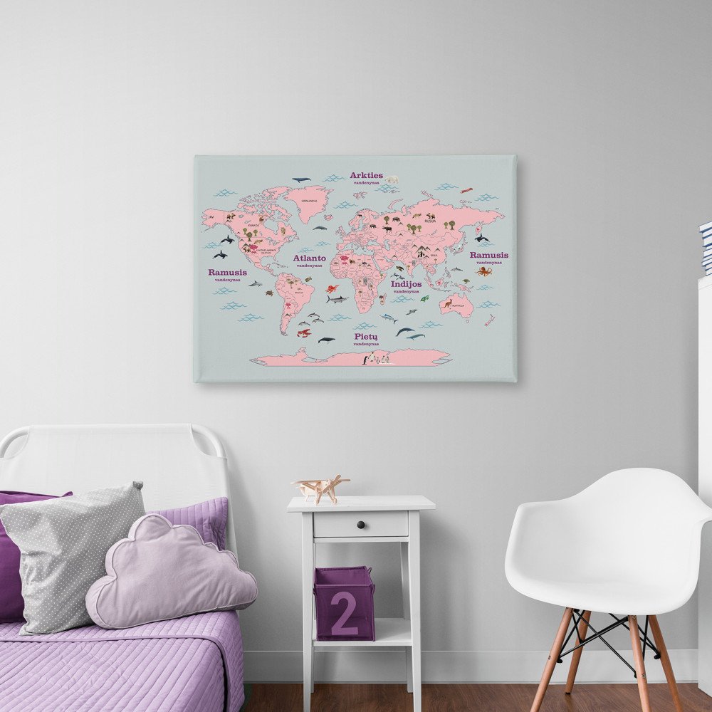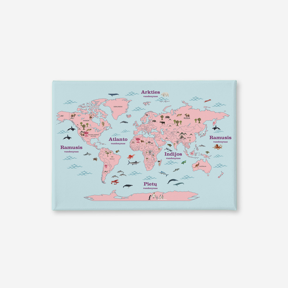 Picture "World map with animals" on canvas - not only a wall decoration, but also a powerful educational tool that encourages students to explore the continents, oceans, and wildlife visually. Each animal visual on the map - from majestic elephants roaming the African savannas to dolphins swimming in the oceans, provides knowledge about the inhabitants existing in the world. On each world map, you can find the names of countries and capitals in Lithuanian, so for every child who can already recognize letters, it is a great practice to learn geography and reading.
