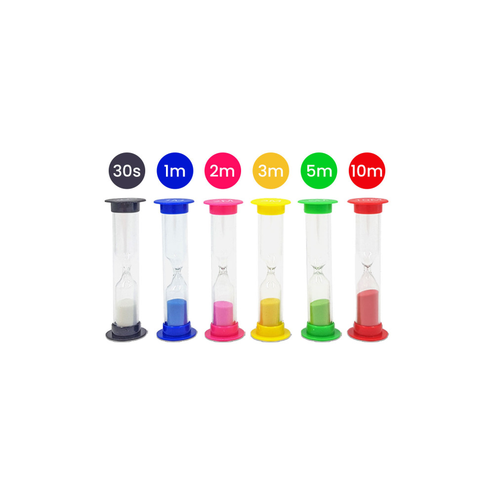 Each colored hourglass marks a different duration - from 30 seconds to 10 minutes. This helps teachers and specialists manage activity time in a playful way, and helps children learn concentration, engagement in tasks, and independence.