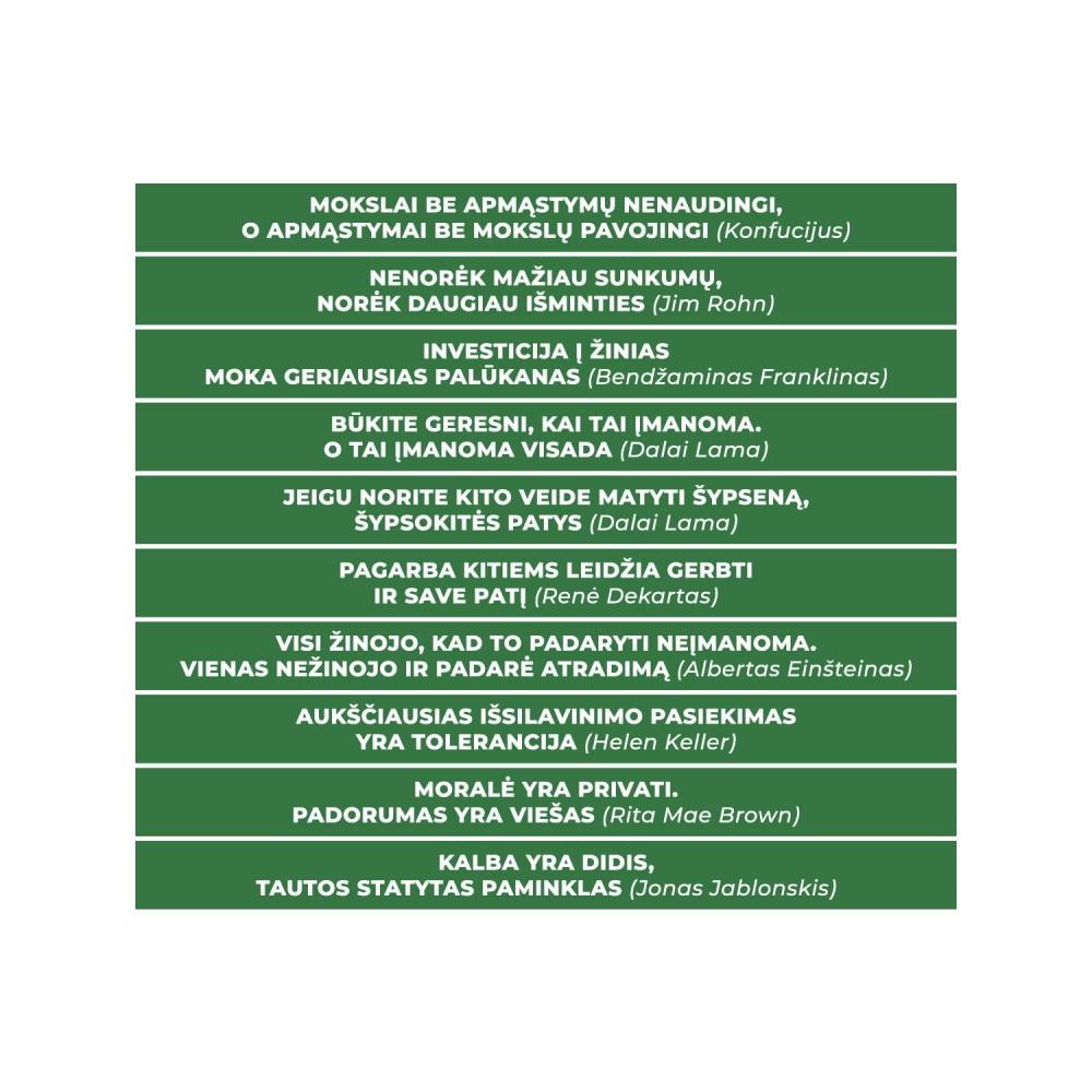 Stickers on stairs with the inscription "Wise stairs" - a unique detail of school, gymnasium interiors that will help create inclusive educational spaces, improve the microclimate of the institution, and the quality of education. High-quality stair stickers with motivating quotes from scientists, spiritual leaders, writers on the way to Lithuanian language, ethics, or other classrooms will contribute to the education of students' tolerance, motivation, and even be one way to achieve better results in maturity exams. Stickers with motivating inscriptions on school stairs that are visible every day are easier to remember and help shape self-awareness. One sticker - 115 cm x 9 cm (if the size does not fit, write to us, we will make it according to your needs) In a set of 10 stickers Advantages: - Easily glued and removed. - The sticker is covered with the highest quality laminate, which will protect the sticker from wear and tear. Attention!